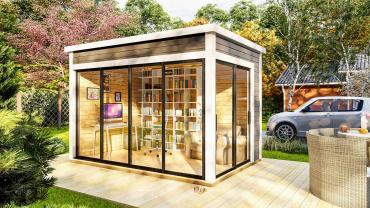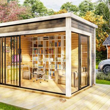 Hagekontor,lysthus, oransjeri - vår nye serie med moderne annekser med det bredeste bruksområdet! Dette luftige rommet med skyvedør lar deg nyte sommerens varme og sjarmerende dufter uten å forlate din favoritt loungestol eller sofa. I kaldt vær kan døren enkelt lukkes og blokkere vind og kulde ute, mens den fantastiske utsikten over hagen og området rundt forblir!