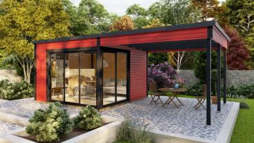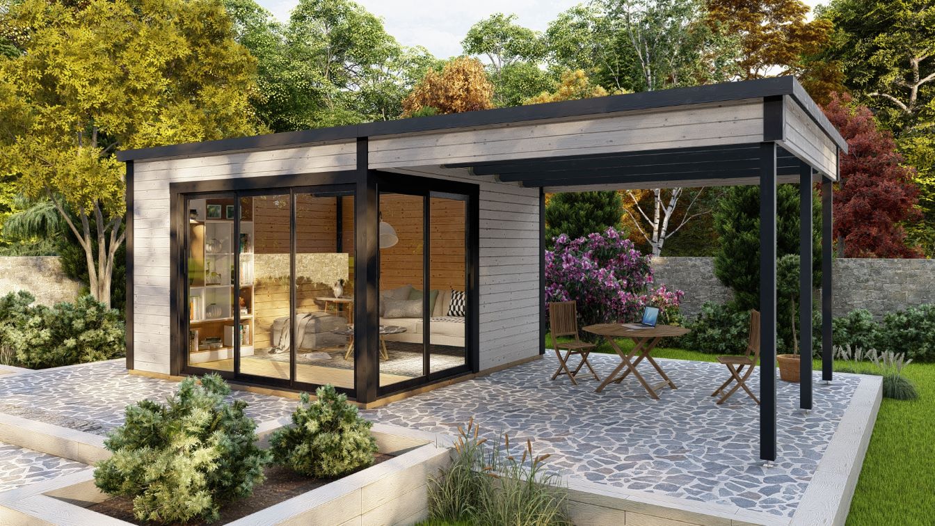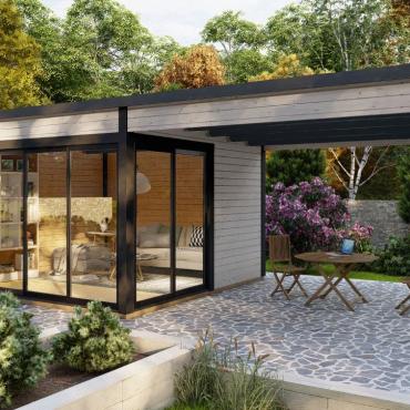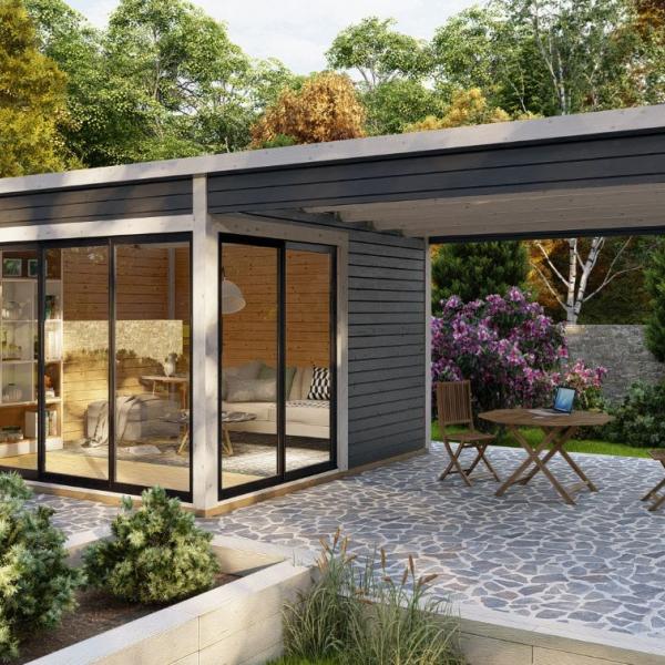 Hagekontor,lysthus, oransjeri - vår nye serie med moderne annekser med det bredeste bruksområdet! Dette luftige rommet med skyvedør lar deg nyte sommerens varme og sjarmerende dufter uten å forlate din favoritt loungestol eller sofa. I kaldt vær kan døren enkelt lukkes og blokkere vind og kulde ute, mens den fantastiske utsikten over hagen og området rundt forblir!