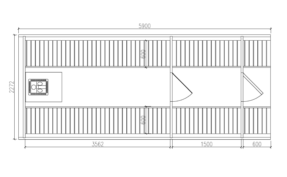 • Terrasse lengde: 0,6 m (i stedet for terrasse kan det utvides omkledningsrom eller badstuedel med 0,6 m uten pristillegg)