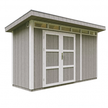 •      Pakken inkluderer bitumen-shingeltak i grå farge, samt metallgesimser langs takets omkrets.