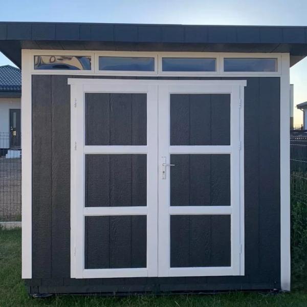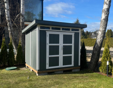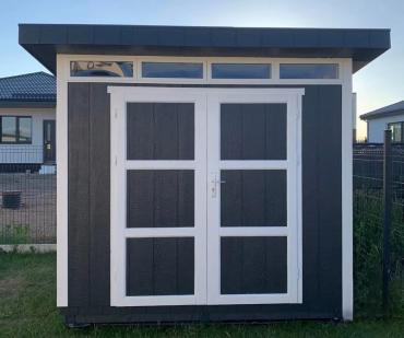 - Pakken inkluderer bitumen-shingeltak i grå farge, samt metallgesimser langs takets omkrets.