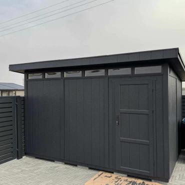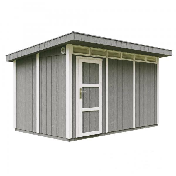 - Pakken inkluderer bitumen-shingeltak i grå farge, samt metallgesimser langs takets omkrets.