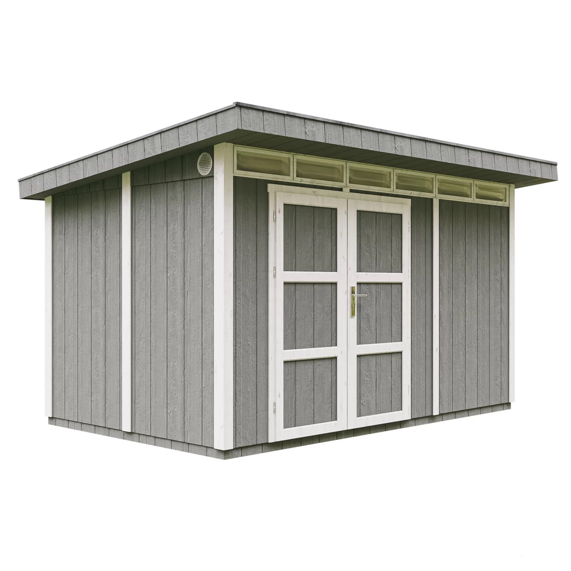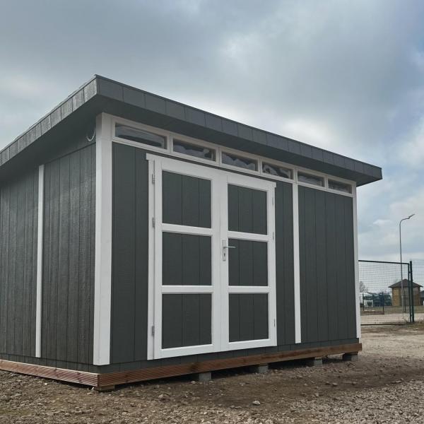 - Pakken inkluderer bitumen-shingeltak i grå farge, samt metallgesimser langs takets omkrets.