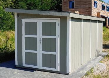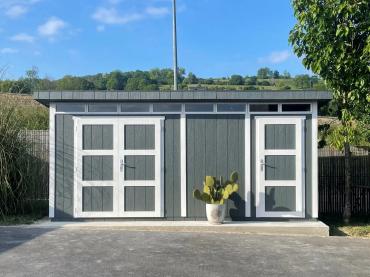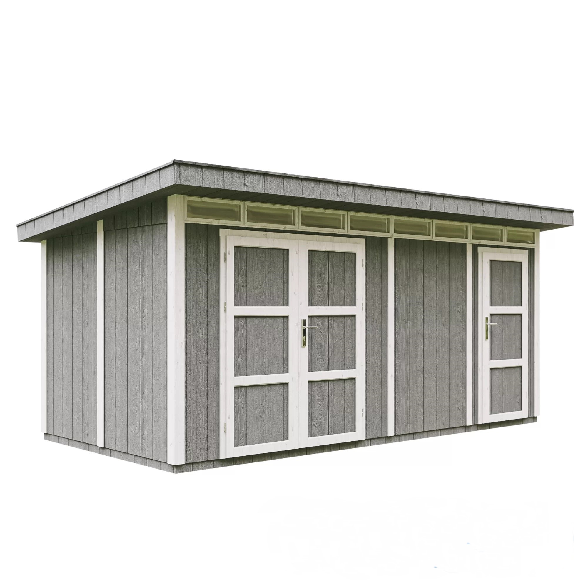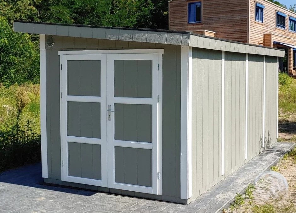 - Pakken inkluderer bitumen-shingeltak i grå farge, samt metallgesimser langs takets omkrets.