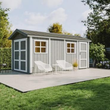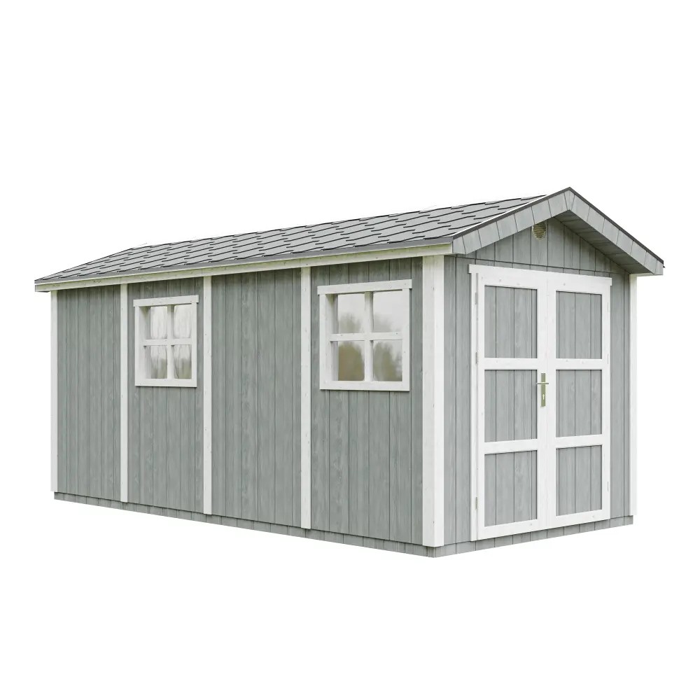 - Pakken inkluderer bitumen-shingeltak i grå farge, samt metallgesimser langs takets omkrets.