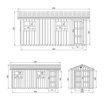 •      Pakken inkluderer bitumen-shingeltak i grå farge, samt metallgesimser langs takets omkrets.
