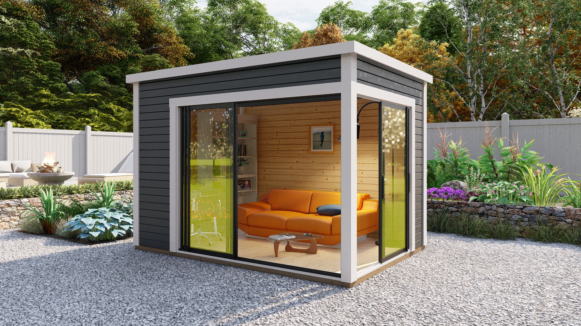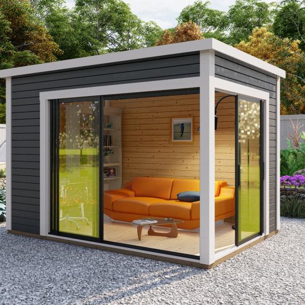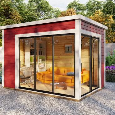 Hagekontor,lysthus, oransjeri - vår nye serie med moderne annekser med det bredeste bruksområdet! Dette luftige rommet med skyvedør lar deg nyte sommerens varme og sjarmerende dufter uten å forlate din favoritt loungestol eller sofa. I kaldt vær kan døren enkelt lukkes og blokkere vind og kulde ute, mens den fantastiske utsikten over hagen og området rundt forblir!