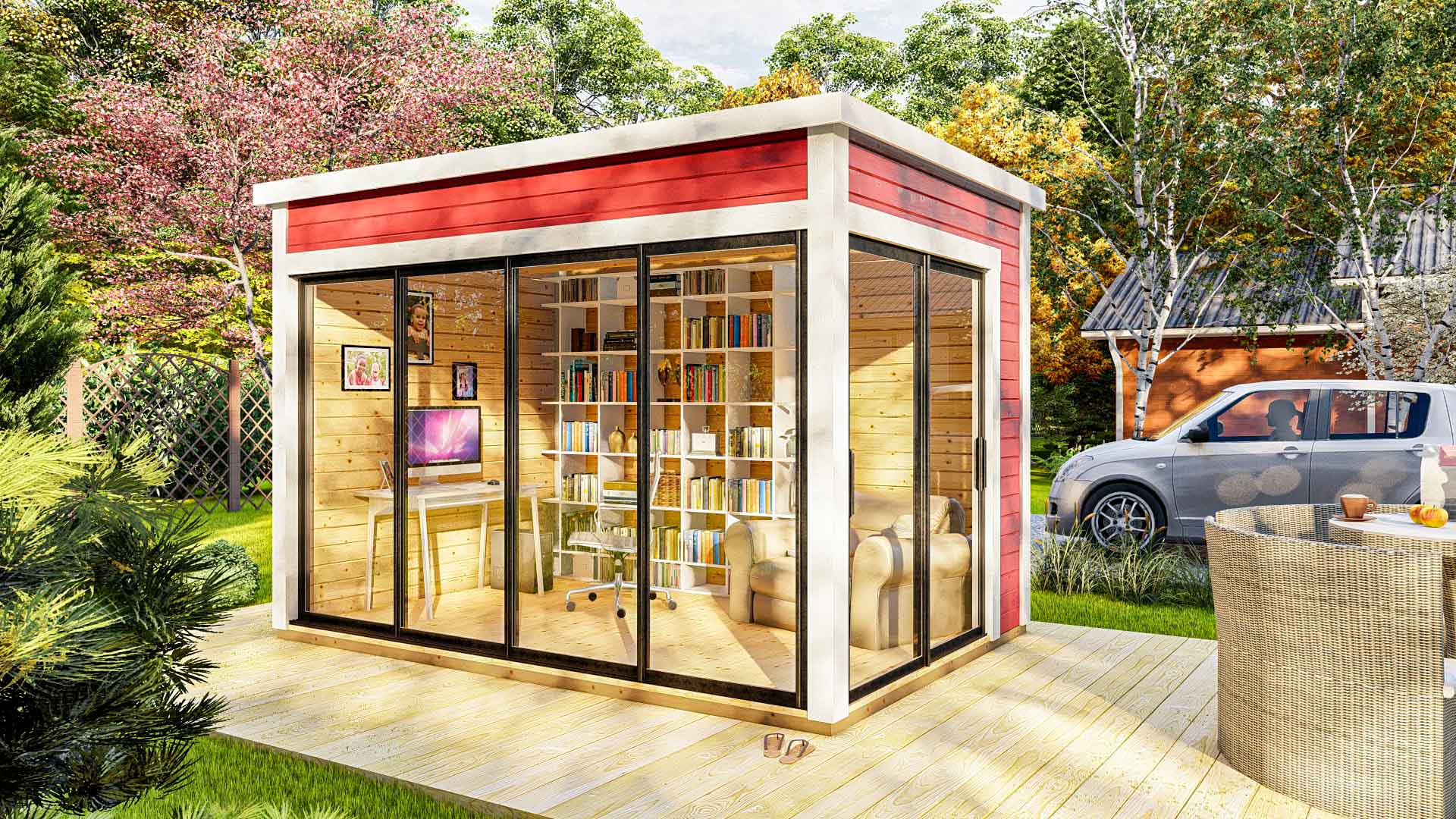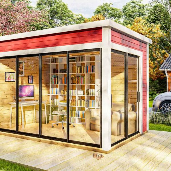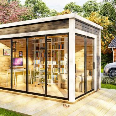 Hagekontor,lysthus, oransjeri - vår nye serie med moderne annekser med det bredeste bruksområdet! Dette luftige rommet med skyvedør lar deg nyte sommerens varme og sjarmerende dufter uten å forlate din favoritt loungestol eller sofa. I kaldt vær kan døren enkelt lukkes og blokkere vind og kulde ute, mens den fantastiske utsikten over hagen og området rundt forblir!