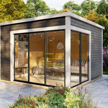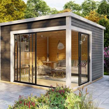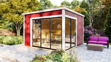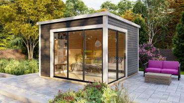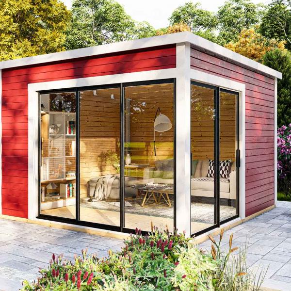 Hagekontor,lysthus, oransjeri - vår nye serie med moderne annekser med det bredeste bruksområdet! Dette luftige rommet med skyvedør lar deg nyte sommerens varme og sjarmerende dufter uten å forlate din favoritt loungestol eller sofa. I kaldt vær kan døren enkelt lukkes og blokkere vind og kulde ute, mens den fantastiske utsikten over hagen og området rundt forblir!