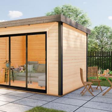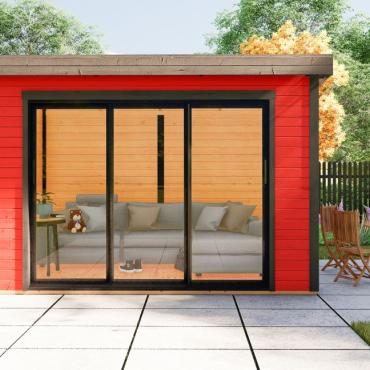 Hagekontor,lysthus, oransjeri - vår nye serie med moderne annekser med det bredeste bruksområdet! Dette luftige rommet med skyvedør lar deg nyte sommerens varme og sjarmerende dufter uten å forlate din favoritt loungestol eller sofa. I kaldt vær kan døren enkelt lukkes og blokkere vind og kulde ute, mens den fantastiske utsikten over hagen og området rundt forblir!