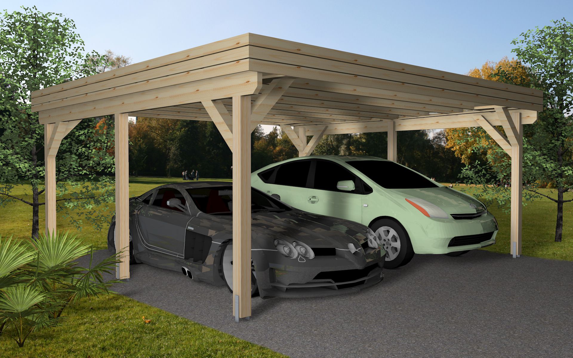 • Carport i limtre konstruksjon (70 % sterkere enn heltre):