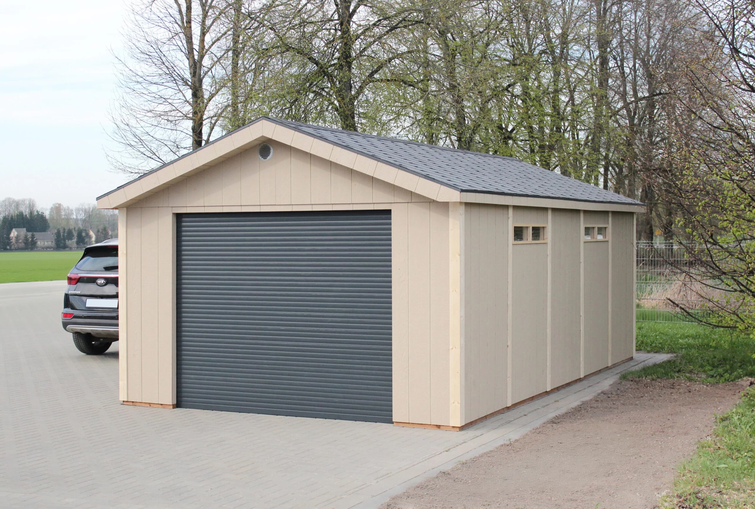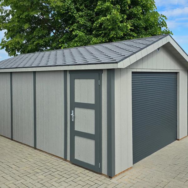 •      Trerammegarasje laget av innovative LP® SmartSide® paneler med elektrisk rulleport