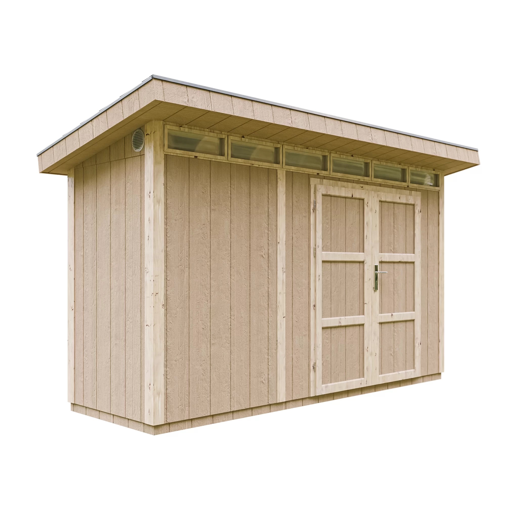 •      Pakken inkluderer bitumen-shingeltak i grå farge, samt metallgesimser langs takets omkrets.