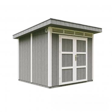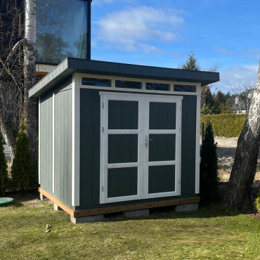 - Pakken inkluderer bitumen-shingeltak i grå farge, samt metallgesimser langs takets omkrets.