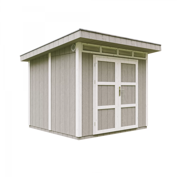 - Pakken inkluderer bitumen-shingeltak i grå farge, samt metallgesimser langs takets omkrets.
