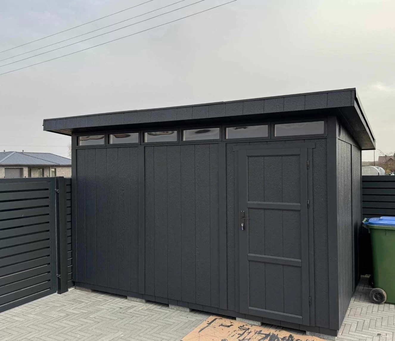 - Pakken inkluderer bitumen-shingeltak i grå farge, samt metallgesimser langs takets omkrets.