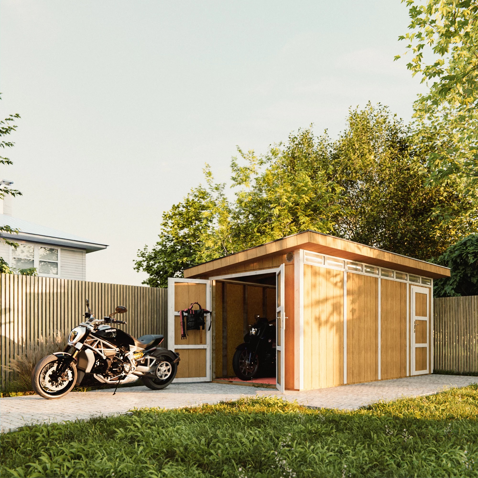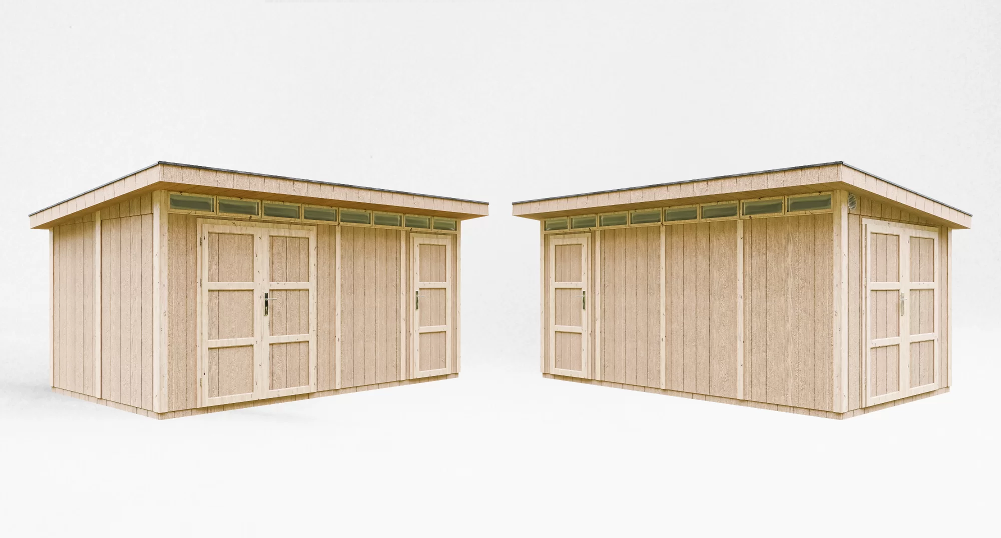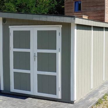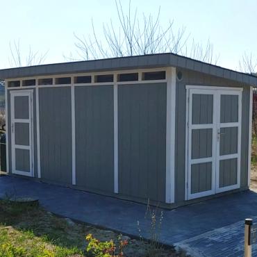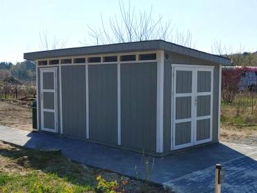 - Pakken inkluderer bitumen-shingeltak i grå farge, samt metallgesimser langs takets omkrets.