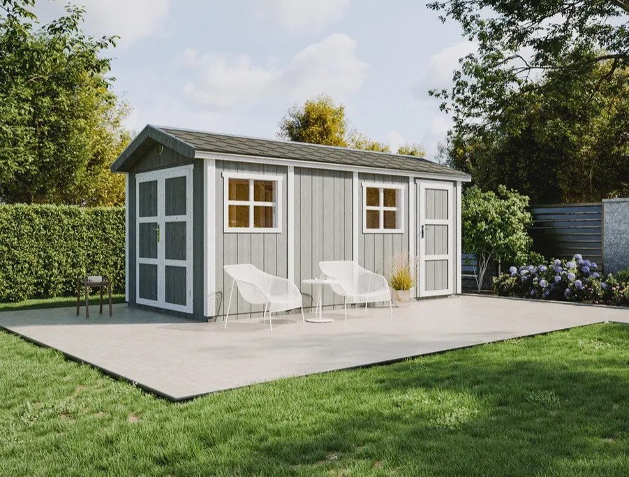 - Pakken inkluderer bitumen-shingeltak i grå farge, samt metallgesimser langs takets omkrets.